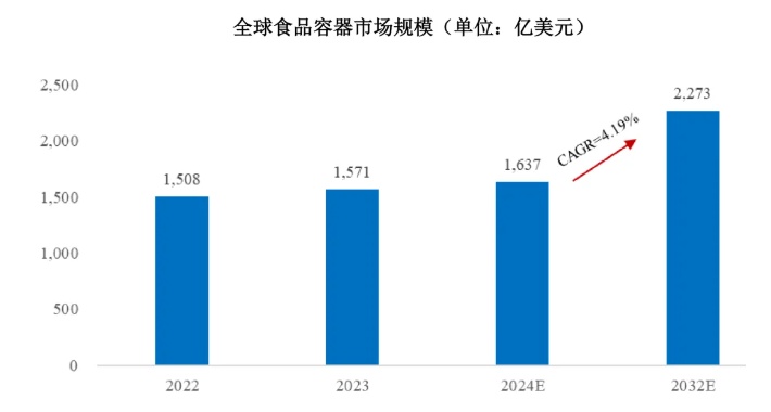According to MarketResearchFuture statistics, the global food container market size in 2023 is USD 157.1 billion, and food containers are expected to grow from USD 163.7 billion in 2024 to USD 227.3 billion in 2032, with a compound annual growth rate of 4.19%.