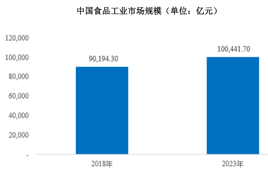 The food industry refers to the category of industry that manufactures food by processing agricultural and sideline products through physical methods or using yeast fermentation. It is closely related to the country's economic development level and the quality of people's lives and is also an important pillar industry for the development of China's national economy. In recent years, China's food industry market has developed steadily. According to data from the National Bureau of Statistics, the market size of China's food industry in 2023 is approximately 10.04 trillion yuan.