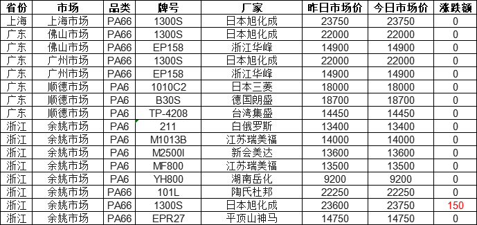 As of 11:00 am on October 21st, the specialized plastics market statistics show that the PA market across various regions nationwide remains stable with some increases! 94% of the market quotations remain stable, with the highest increase being 150 yuan. Currently, the price of Asahi Kasei 1300S in the Yuyao market is quoted at 23,750 yuan. Today's PA market quotation range is from 9,200 to 23,750 yuan, with the market median at 14,900 yuan.