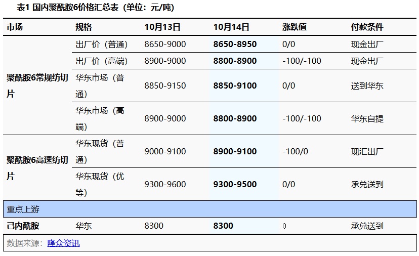 Today, the nylon 6 market is operating weakly, with multiple negative factors affecting the market. The raw material market is undergoing weak adjustments, providing limited cost support. Furthermore, due to limited downstream demand, the procurement of raw materials is relatively cautious. Manufacturers are slow in shipping, low-priced slices frequently appear, and actual transactions are subject to negotiation. East PA6 regular spinning ordinary price is 8850-9100 RMB/ton cash short delivery, high-speed spinning spot price is 9300-9500 RMB/ton with acceptance delivery. Chao Lake price is 8250-8350 RMB/ton cash self-pickup.