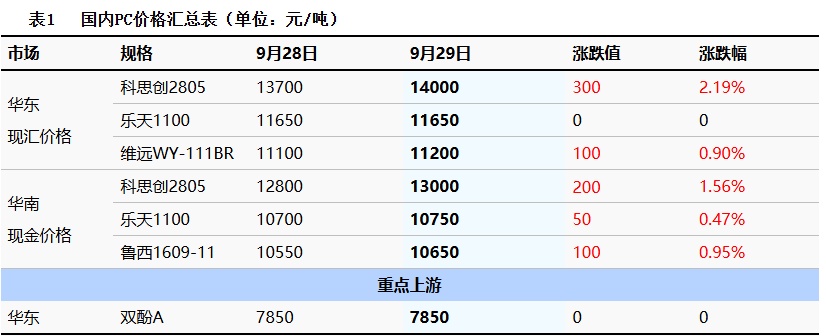 Table 1 Domestic PC Price Summary (Unit: Yuan/Ton)