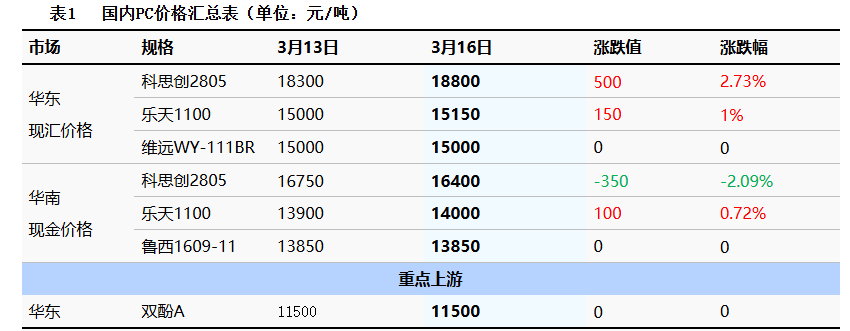 Table 2 Domestic PC Data Overview (Unit: RMB/ton)