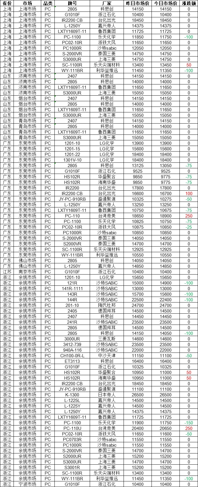 According to statistics from Zhuangsu Shijie, as of 4:00 PM on October 14, the PC market across the country is steady with a slight decline! 73% of the market prices remain stable, with the maximum drop being 150 yuan. Currently, the price of Lotte Chemical's PC-1100 in the Yuyao market is 11,750 yuan. Today's price range for PC in the entire market is 9,525 to 26,500 yuan, with a market median of 14,050 yuan.