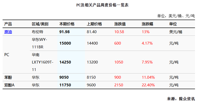 In this cycle, the domestic PC market showed a wide fluctuation trend. As of the close on March 12th, the negotiation price of domestic material in the East China market was in the range of 13,400-16,750 yuan/ton, an increase of 600-2,050 yuan/ton from the previous week, with a growth rate of 4.17%-13.95%. At the beginning of the week, international crude oil strongly broke through $100/barrel, with Brent crude oil prices reaching $91.98/barrel, an increase of $10.58/barrel from the previous period, a growth rate of 13%, which led to a significant increase in the prices of upstream raw materials. The factory prices of PC generally rose by 3,000-5,000 yuan/ton, with some factories adjusting prices appropriately later. On Tuesday, the auction price of Zhejiang Petrochemical opened and closed at a high, an increase of 1,300 yuan/ton from the previous period. In the spot market, influenced by the chain's rising sentiment and factory price adjustments, spot prices surged at the beginning of the week. However, the transmission of costs to the downstream was hindered, and high-price transactions were weak; meanwhile, the number of low-priced goods in the market increased, and holders were actively selling to make profits, leading to a significant drop in the price center. In the latter half and middle of the week, international crude oil prices fluctuated, and the chain prices followed, with low purchasing enthusiasm from downstream factories, and slow digestion of profit-taking, resulting in the overall PC price maintaining a narrow range oscillation.