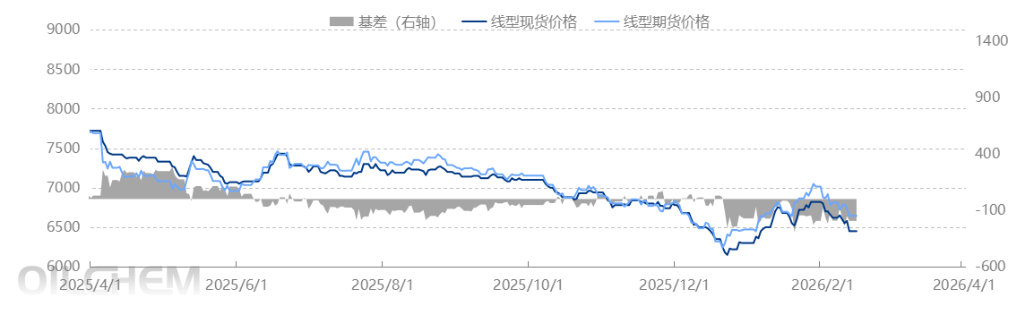 The main LL futures contract fluctuated and increased, opening at 7350 yuan/ton. As of 15:00, the closing price was 7355 yuan/ton, up 262 yuan/ton from the previous settlement day's settlement price. The trading volume was 1.382 million lots, and the open interest was 381,700 lots. Today's futures-spot basis was -175 yuan/ton, an increase of 25 yuan/ton from the previous working day.