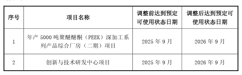 On August 27, Zhongyan Co., Ltd. announced the decision to postpone the completion date of its initial public offering fundraising projects, specifically the "Annual Production of 5,000 Tons of Polyether Ether Ketone (PEEK) Deep Processing Series Products Comprehensive Plant (Phase II) Project" and the "Innovation and Technology Research and Development Center Project" from September 2025 to September 2026. As of the announcement date, the infrastructure construction of the "Annual Production of 5,000 Tons of Polyether Ether Ketone (PEEK) Deep Processing Series Products Comprehensive Plant (Phase II)" has been smoothly implemented, and the main building has passed acceptance inspection. The main reason for the delay is the need to make dynamic adjustments and reasonable decisions based on changes in the market environment and policies during the project implementation process, in order to effectively control costs, reduce risks, and enhance asset liquidity.