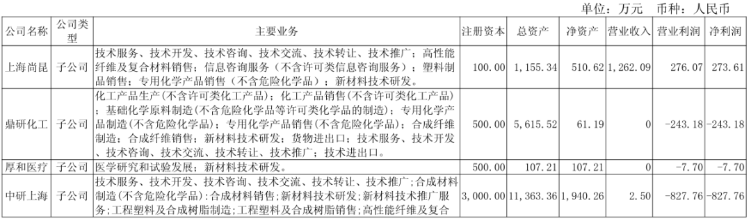 In addition, Zhongyan Co., Ltd. currently has subsidiaries (including joint ventures) such as Shanghai Shangkun, Dingyan Chemical, Houhe Medical, Zhongyan Shanghai, Zhongyan Shenzhen, and Zhongyan New Materials. On January 16 of this year, it established a secondary subsidiary, Zhongyan Composite Materials (Shanghai) Aerospace Technology Development Co., Ltd., mainly for the research and development of new material technologies. It is worth mentioning that Zhongyan Co., Ltd. has decided to increase its investment in Dingyan Chemical by 45 million yuan using its own funds; to increase its investment in Shanghai Zhongyan by 70 million yuan (raising 43.204 million yuan + using 26.796 million yuan of its own funds); and to increase its investment in Zhongyan Shenzhen by 20 million yuan using its own funds.