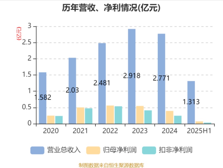 In the first half of 2025, the company achieved a total operating revenue of 131 million yuan, a year-on-year decrease of 2.10%; the net profit attributable to shareholders was 7.0269 million yuan, a year-on-year decrease of 59.89%.