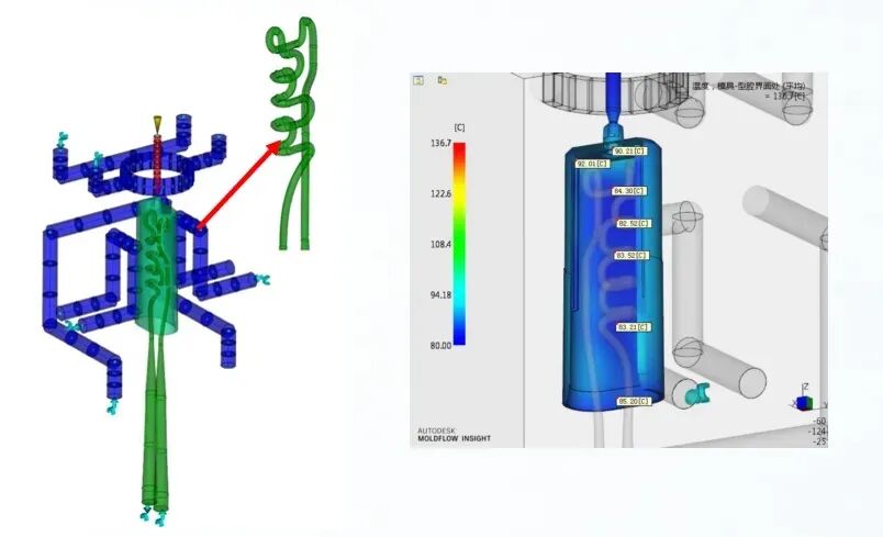 The Bosch automotive ECU (engine control unit) housing, which features a cavity mold structure, had a traditional molding cycle time of 42 seconds. Through the conformal cooling solution analyzed by Mr. Zhu’s team, the cycle time was reduced to 28 seconds. When implemented, dedicated mold temperature controllers were installed on both the front and rear molds, ultimately compressing the molding cycle to within 22 seconds. This achievement resulted in a "win-win-win" situation: Bosch was satisfied due to the shortened cycle time and reduced costs; Rongke Xuyang’s direct client (Bosch’s injection molding supplier) gained more profits from improved efficiency; and Rongke Xuyang solidified its cooperation through technological strength — the project has now successfully entered mass production.