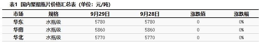 The spot price of polyester bottle-grade chips in East China closed at 5780 today, remaining unchanged from the previous working day and basically in line with the morning expectations.