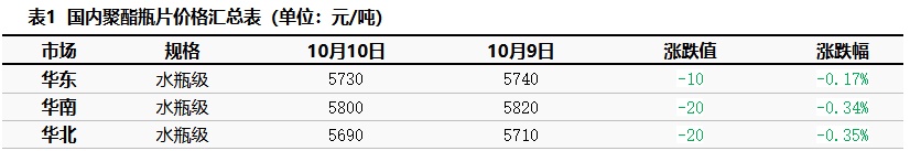 Based on the East China region, the spot price of polyester bottle-grade PET closed at 5730 today, down 10 from the previous working day, in line with the morning expectations.