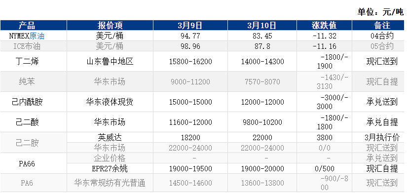 1. [Longzhong] March 10: Markets anticipate that the Iran-Israel conflict may conclude sooner than expected, and the G7 group may release strategic petroleum reserves, leading to a decline in international oil prices. NYMEX crude oil futures (April contract) fell by USD 11.32 per barrel to USD 83.45, a decrease of 11.94% week-on-week; ICE Brent crude oil futures (May contract) fell by USD 11.16 per barrel to USD 87.80, a decrease of 11.28% week-on-week. China’s INE crude oil futures (April 2026 contract) declined by CNY 14.2 to CNY 732.4 per barrel, and dropped by CNY 90.4 to CNY 642 per barrel during the night session.