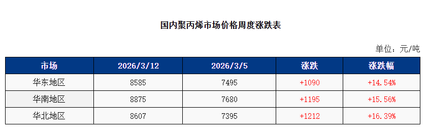 This week, the polypropylene market experienced a rollercoaster trend dominated by the Middle East geopolitical situation. Spot prices in the East China, South China, and North China regions all saw significant increases. The average price in East China was 8,585 yuan/ton, up 1,090 yuan/ton from last week, a rise of 14.54%. The average price in South China was 8,875 yuan/ton, up 1,195 yuan/ton from last week, a rise of 15.56%. The average price in North China was 8,607 yuan/ton, up 1,212 yuan/ton, a rise of 16.39%. As of the 12th, the national average price for granulate was 8,657 yuan/ton, up 1,163 yuan/ton from last week, a rise of 15.52%.