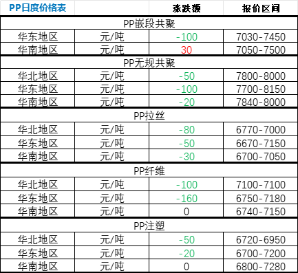 According to specialized statistics from Zhuansu Shijie, on September 23, the PP market in major regions across the country experienced more declines than increases. Specifically: PP block copolymer in the East China market fell by 100 yuan; the South China market rose by 30 yuan. PP random copolymer in the North China market fell by 50 yuan; the East China market fell by 100 yuan; the South China market fell by 20 yuan. PP filament in the North China market fell by 80 yuan; the East China market fell by 50 yuan; the South China market remained unchanged from the previous day. PP injection molding in the North China market fell by 50 yuan; the East China market fell by 20 yuan; the South China market remained unchanged from the previous day.