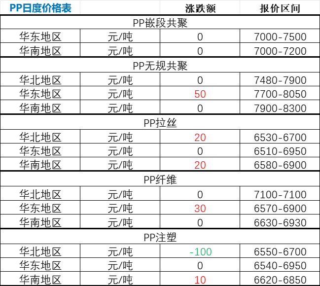 According to Zhuansu Shijie's statistics, on October 27th, the PP market in major regions nationwide mostly increased with few decreases. Specifically: - PP block copolymer: East China market remained unchanged compared to yesterday; South China market remained unchanged compared to yesterday. - PP random copolymer: North China market remained unchanged compared to yesterday; East China market increased by 50 yuan; South China market remained unchanged compared to yesterday. - PP filament: North China market increased by 20 yuan; East China market remained unchanged compared to yesterday; South China market increased by 20 yuan. - PP fiber: North China market remained unchanged compared to yesterday; East China market increased by 30 yuan; South China market remained unchanged compared to yesterday. - PP injection molding: North China market decreased by 100 yuan; East China market remained unchanged compared to yesterday; South China market increased by 10 yuan.