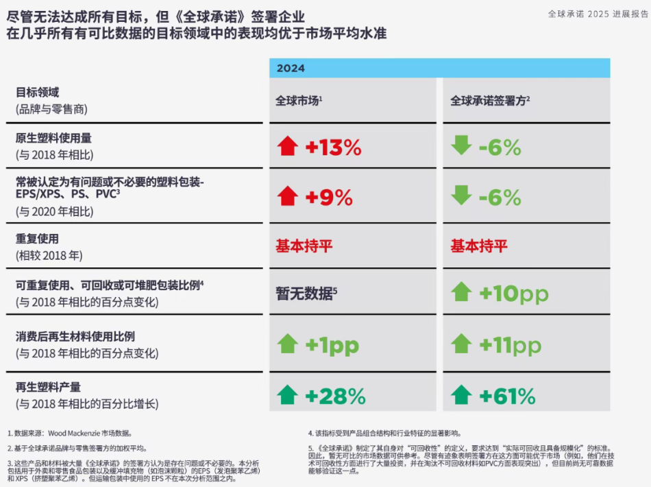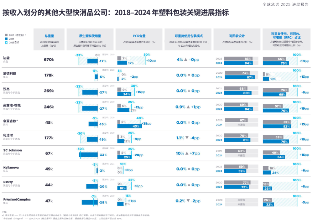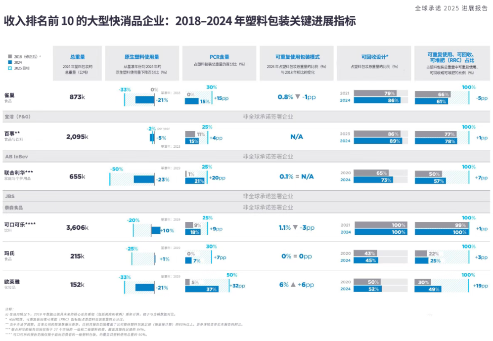 Among the top ten fast-moving consumer goods companies globally in terms of revenue, Nestlé, PepsiCo, Unilever, Coca-Cola, Mars, and L'Oréal are signatories of the "Global Commitment," while Procter & Gamble, AB InBev, JBS, and Tyson Foods have not joined the initiative. Between 2018 and 2024, the six signatory companies have made the following progress on key sustainability indicators for plastic packaging: