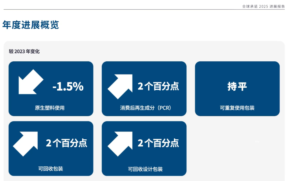 According to the annual progress overview data, compared to 2023, the use of virgin plastics decreased by 1.5%; the proportion of post-consumer recycled content (PCR) increased by 2 percentage points; the proportion of recyclable packaging grew by 2 percentage points; the proportion of packaging designed for recyclability also increased by 2 percentage points; while the proportion of reusable packaging remained unchanged.