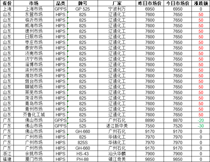 As of 11:00 am on October 29, the specialized plastics market statistics show that most PS markets across the country are on the rise! 68% of the overall market prices have increased, with the highest increase of 50 yuan. Currently, the Liaotong Chemical 825 price in the Dongying market is 7,650 yuan. Today's overall market PS price range is 6,950-9,850 yuan, with a market median of 7,650 yuan.