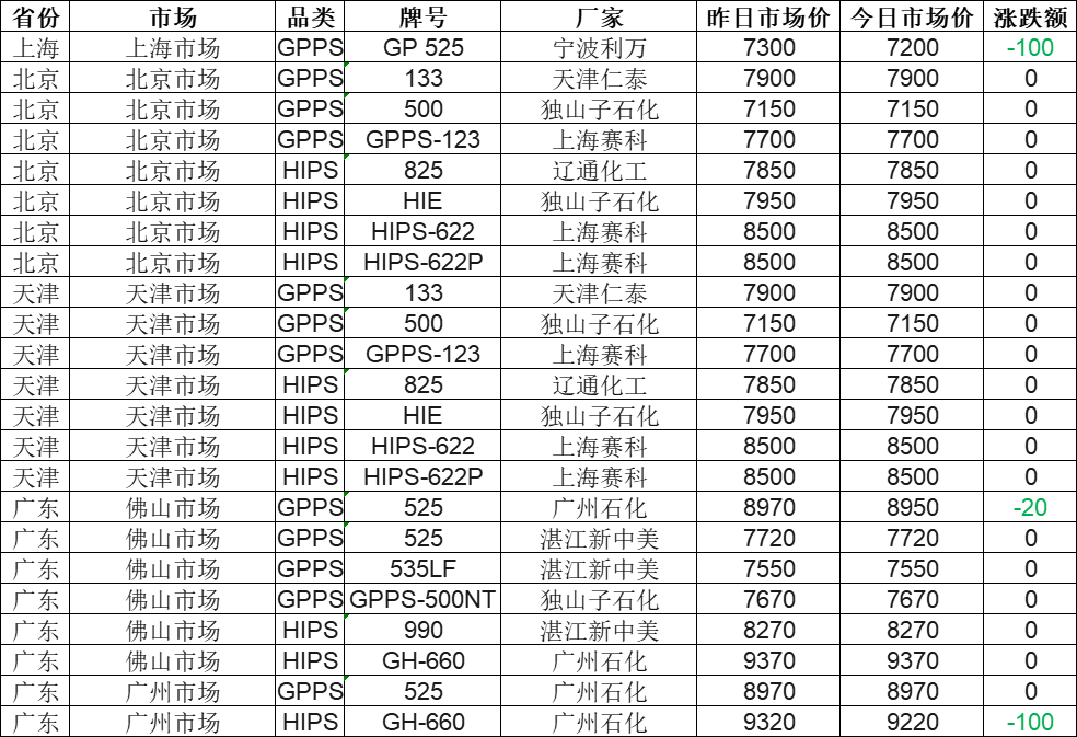 According to Zhuangsu Shijie statistics, as of 11:00 AM on October 11, the PS market across the country is stable with a slight decline! 87% of the market quotes remain stable, with the largest decrease being 100 yuan. Currently, the price for Ningbo Liwan GP 525 in the Shanghai market is 7200 yuan. Today's price range for PS in the entire market is 7150-9370 yuan, with a market median of 7900 yuan.
