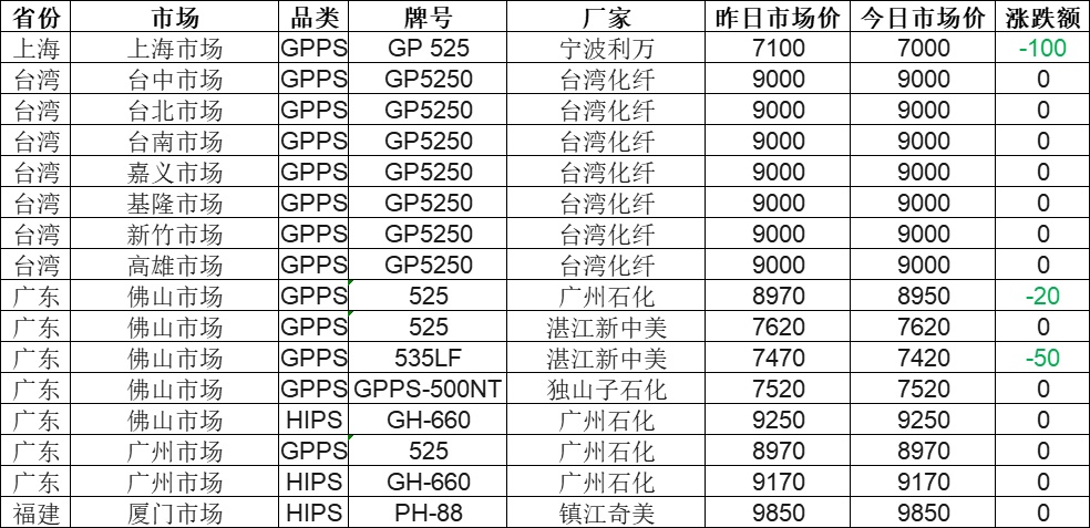 As of 11:00 AM on October 15th, according to the specialized plastics market statistics, the PS market across the country remains stable with a slight decrease. 81% of the overall market quotations remain stable, with a maximum decrease of 100 yuan. The current quote for Ningbo Liwan GP 525 in the Shanghai market is 7,000 yuan. Today's PS market quotation range is between 7,000 and 9,850 yuan, with a median of 9,000 yuan.