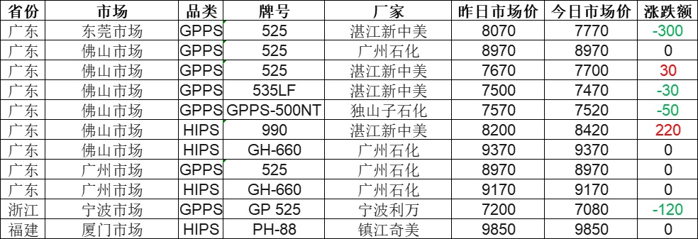 As of 11:00 am on October 14, according to Zhuan Su Shi Jie statistics, the PS market across the country has been stable with some declines. 45% of the market quotations remain stable, with a maximum drop of 300 yuan. Currently, the price for Zhanjiang New Zhongmei 525 in the Dongguan market is quoted at 7,770 yuan. Today's overall PS market quotation range is 7,080-9,850 yuan, with a market median of 8,420 yuan.