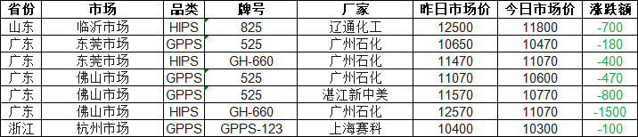 According to Zhuan Su Shi Jie’s statistics, as of 11:00 a.m. on March 11, PS prices across most regions nationwide declined. All market quotations fell, with the largest drop reaching RMB 1,500 per ton. Currently, the Guangzhou Petrochemical GH-660 grade PS is quoted at RMB 11,070 per ton in the Foshan market. Today’s nationwide PS quotation range is RMB 10,300–11,800 per ton, with a market median of RMB 10,770 per ton.