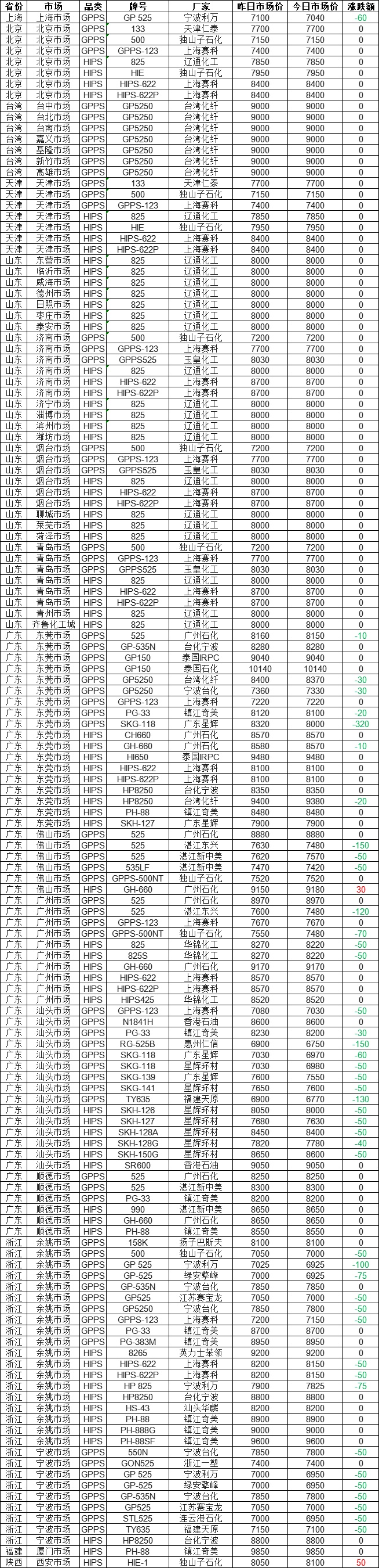 According to statistics from Zhuansu Shijie, as of 16:00 on October 15, the PS market across the country is stable with a slight decline! 67% of the quotes in the entire market remain stable, with the largest drop being 320 yuan. Currently, the price of Guangdong Xinghui SKG-118 in the Dongguan market is 8000 yuan. Today's price range for PS in the entire market is 6750-10140 yuan, with a market median of 8000 yuan.