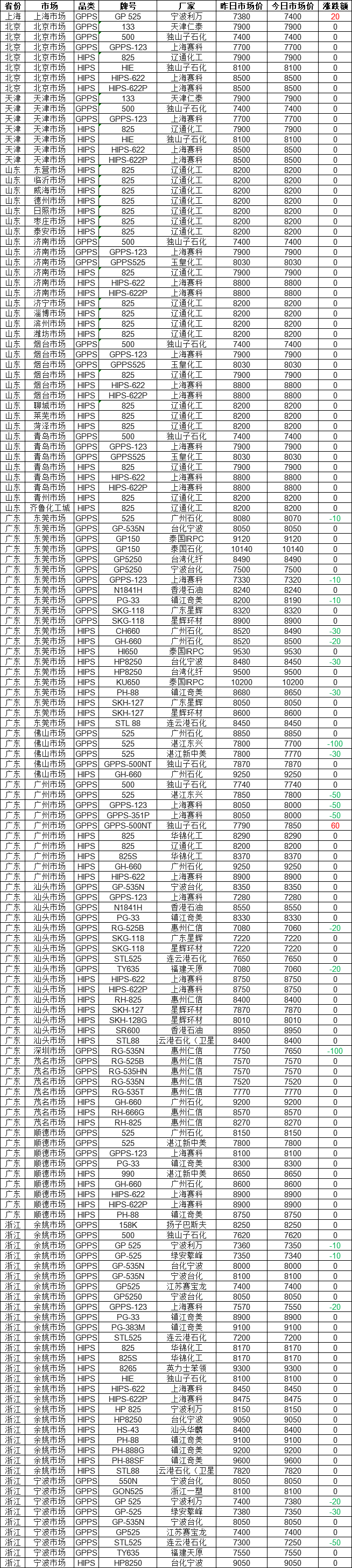 As of 16:00 on September 26th, according to statistics from the Specialized Plastics World, the PS market across various regions in China is stable with slight declines. 85% of the market prices remain stable, with a maximum drop of 100 yuan. The current quotation for Zhanjiang Dongxing 525 in the Foshan market is 7,700 yuan. Today's quotation range for the entire PS market is 7,060-10,200 yuan, with a market median of 8,200 yuan.