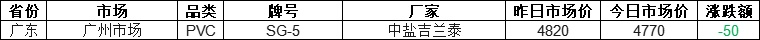 As of 11:00 AM on October 9th, the specialized plastics market statistics show that the PVC market across all regions in the country is mostly in the red! 100% of the market quotes have dropped, with a maximum decrease of 50 yuan. Currently, the Zhongyan Jilantai SG-5 in the Guangzhou market is quoted at 4770 yuan. Today's PVC market quote range is 4770-4770 yuan, with a median of 4770 yuan.