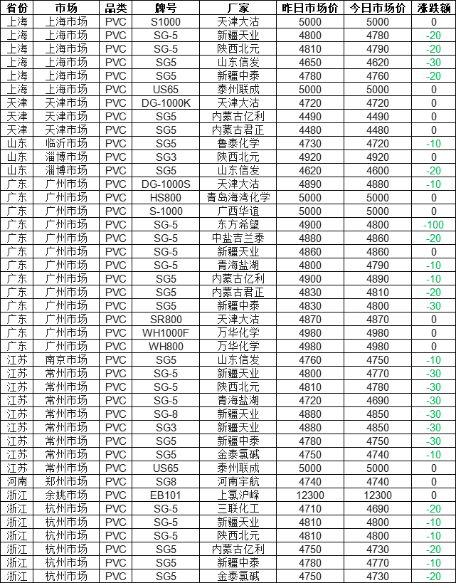 As of 4:00 PM on September 26, according to Zhuan Su Shi Jie statistics, the PVC market in most regions across the country is mostly declining. 64% of the market quotations have dropped, with the largest decrease being 100 yuan. The current quotation for Dongfang Hope SG-5 in the Guangzhou market is 4800 yuan. Today's PVC market quotation range is between 4480 and 12300 yuan, with the median being 4795 yuan.