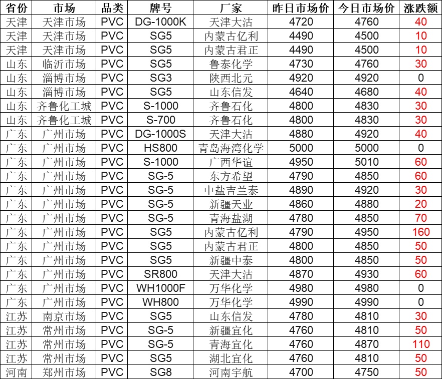 As of 16:00 on September 16, according to Zhuan Su Shi Jie statistics, the PVC market in most regions across the country is on the rise! 85% of the market quotations have increased, with the highest rise being 160 yuan. Currently, the Inner Mongolia Yili SG5 is quoted at 4950 yuan in the Guangzhou market. Today's PVC market quotation range is from 4500 to 5010 yuan, with a market median of 4850 yuan.
