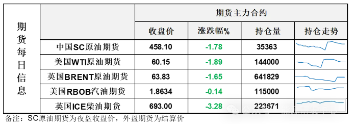 On October 28, the market focused on the continuation of the OPEC+ production increase plan, coupled with a still poor demand outlook, leading to a decline in international oil prices. NYMEX crude oil futures for the December contract fell by $1.16 per barrel to $60.15, a decrease of 1.89% compared to the previous period. ICE Brent crude oil futures for the December contract fell by $1.22 per barrel to $64.40, a decrease of 1.86% compared to the previous period. China's INE crude oil futures for the 2512 contract fell by 2.0 to 466.4 yuan per barrel, and the night session dropped by 8.3 to 458.1 yuan per barrel.