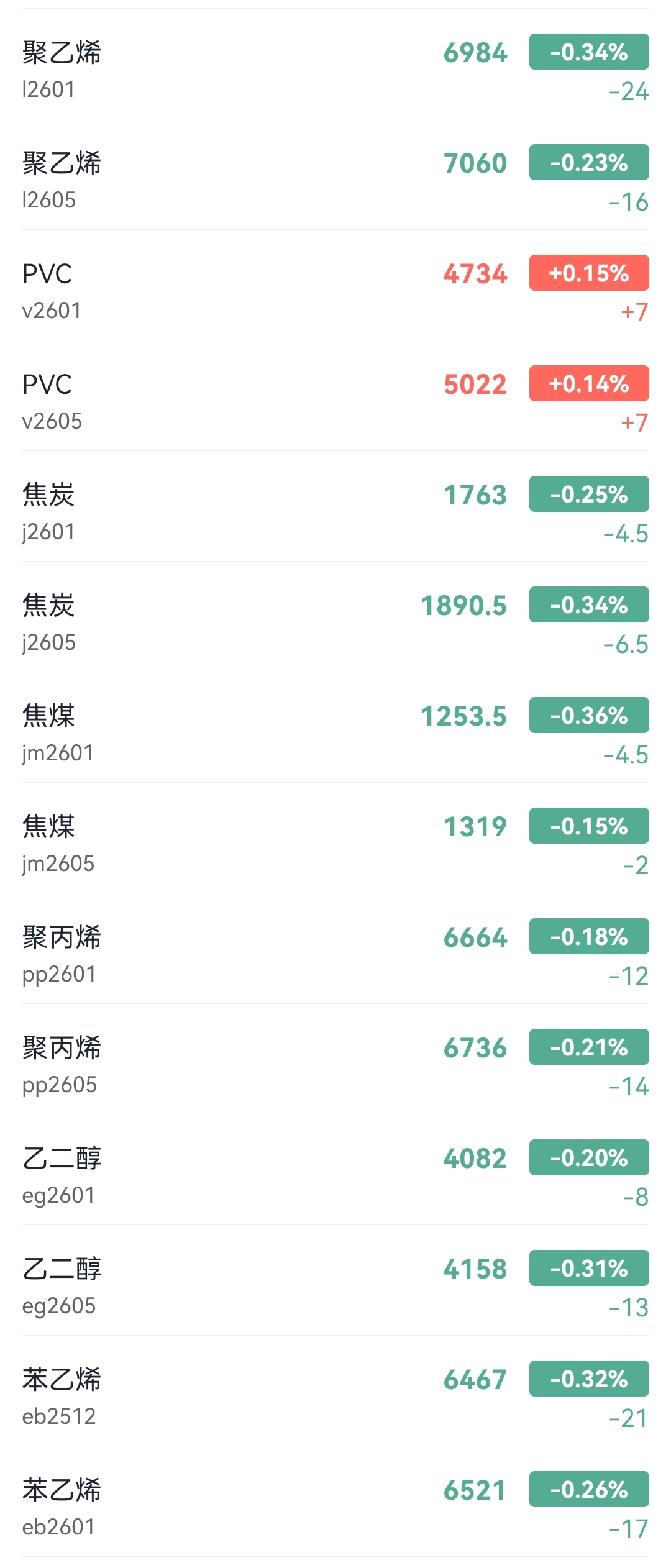 The plastic 2601 contract was quoted at 6984 yuan/ton, down 0.34% from the previous trading day.