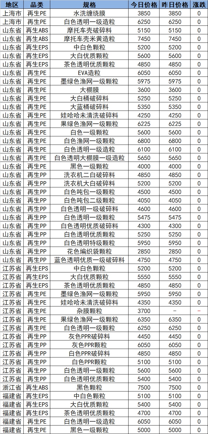 Summary: New Prices for Recycled Plastics Market in East China on the Morning of October 10th! The recycled market in East China is operating steadily, with recycled PE in Shanghai quoted at 3850-6250, recycled EPS in Shandong quoted at 4850-5600, and recycled PE in Jiangsu quoted at 3700-6350. The market is slowly recovering after the holiday, and industry players in the recycling supply chain are not highly motivated to operate, mostly cautiously observing market dynamics, with few actual transactions.