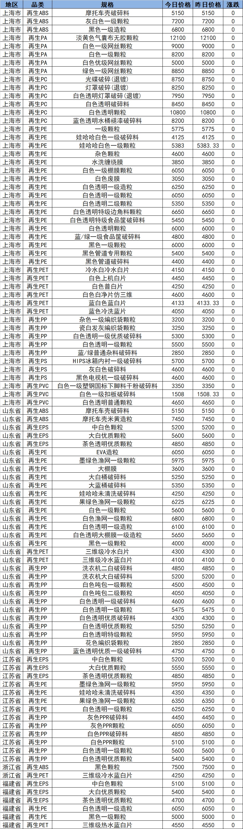 Summary: On September 26, the recycled plastic market in East China opened with new prices! The East China recycled market remained stable across the board, with recycled ABS in Shanghai quoted at 5150-7200, recycled PC at 7950-10800, recycled ABS in Shandong at 5150-7450, and recycled PE in Jiangsu at 4350-6350. Market transactions are small, and actual deals are mostly negotiated. Currently, recycled manufacturers are producing and selling simultaneously, with decent spot supply and stable price quotes.