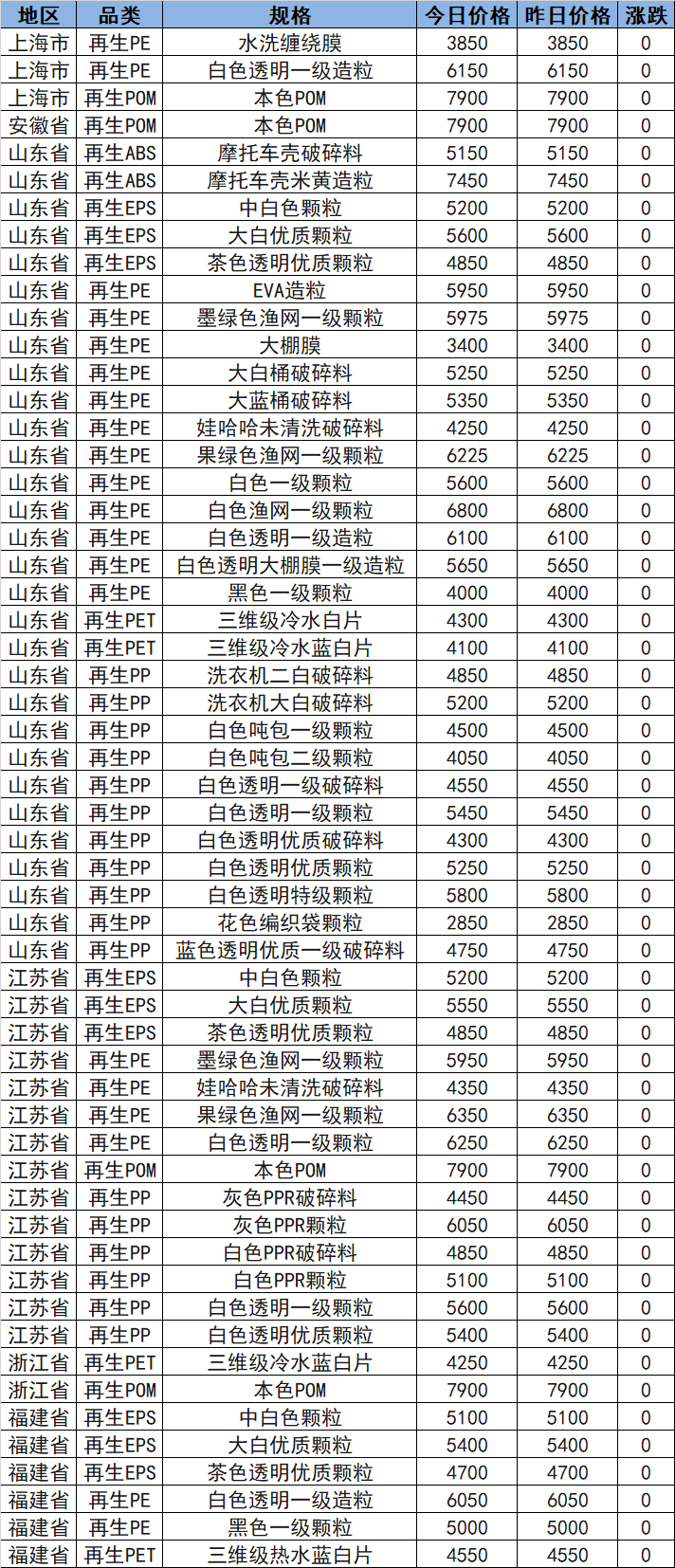 Summary: New prices for the recycled plastics market in East China on the morning of October 20! The East China recycled market is operating horizontally, with recycled PE in Shandong reported at 3400-6800, recycled PE in Shanghai reported at 3850-6150, recycled PE in Jiangsu reported at 4350-6350, and recycled POM in Zhejiang reported at 7900. The recycled plastics market has limited trading, with most transactions conducted through negotiation.