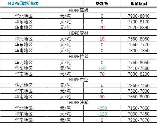 According to Zhuansu Shijie statistics, on September 26, the HDPE market in major regions across the country saw more increases than decreases. Specifically: the HDPE film market in North China remained unchanged from yesterday; the East China market remained unchanged; the South China market rose by 20 yuan. The HDPE pipe market in North China rose by 10 yuan; the East China market remained unchanged; the South China market remained unchanged. The HDPE wire drawing market in North China remained unchanged; the East China market fell by 20 yuan; the South China market rose by 70 yuan. The HDPE hollow market in North China remained unchanged; the East China market remained unchanged; the South China market rose by 80 yuan. The HDPE injection molding market in North China fell by 250 yuan; the East China market fell by 120 yuan; the South China market remained unchanged.