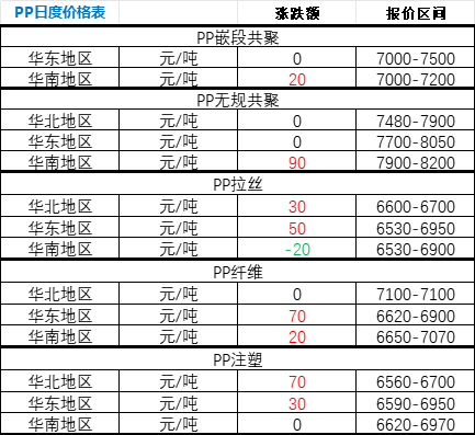 According to Zhuansu Shijie statistics, on October 28, the PP market in major regions across the country saw more increases than decreases. Specifically: the PP block copolymer in the East China market remained the same as yesterday; the South China market increased by 20 yuan. The PP random copolymer in the North China market remained the same as yesterday; the East China market remained the same as yesterday; the South China market increased by 90 yuan. The PP staple fiber in the North China market increased by 30 yuan; the East China market increased by 50 yuan; the South China market decreased by 20 yuan. The PP fiber in the North China market remained the same as yesterday; the East China market increased by 70 yuan; the South China market increased by 20 yuan. The PP injection molding in the North China market increased by 70 yuan; the East China market increased by 30 yuan; the South China market remained the same as yesterday.