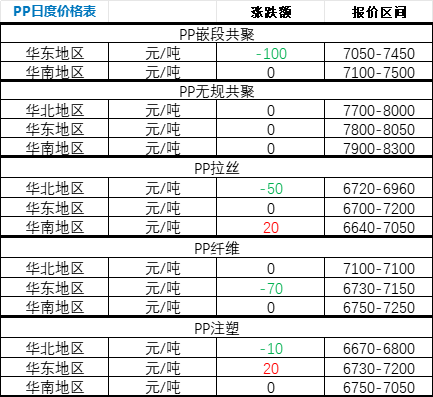 According to statistics from Zhuangsu Shijie, on September 30th, the PP market in major regions across the country saw more declines than increases. Specifically, PP block copolymer in the East China market dropped by 100 yuan; the South China market remained unchanged from the previous day. PP random copolymer in the North China market remained unchanged from the previous day; the East China market remained unchanged; the South China market remained unchanged. PP raffia in the North China market dropped by 50 yuan; the East China market remained unchanged; the South China market increased by 20 yuan. PP fiber in the North China market remained unchanged; the East China market dropped by 70 yuan; the South China market remained unchanged. PP injection molding in the North China market dropped by 10 yuan; the East China market increased by 20 yuan; the South China market remained unchanged.