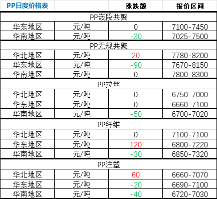 According to the statistics from Zhuan Su Shi Jie on September 26, the PP market in major regions across the country saw more declines than increases. Specifically: the PP Block Copolymer market in East China remained unchanged compared to yesterday; the South China market decreased by 30 yuan. The PP Random Copolymer market in North China increased by 20 yuan; the East China market decreased by 90 yuan; the South China market remained unchanged. The PP Raffia market in North China remained unchanged compared to yesterday; the East China market remained unchanged; the South China market decreased by 50 yuan. The PP Fiber market in North China remained unchanged; the East China market increased by 120 yuan; the South China market decreased by 30 yuan. The PP Injection Molding market in North China increased by 60 yuan; the East China market decreased by 20 yuan; the South China market decreased by 40 yuan.