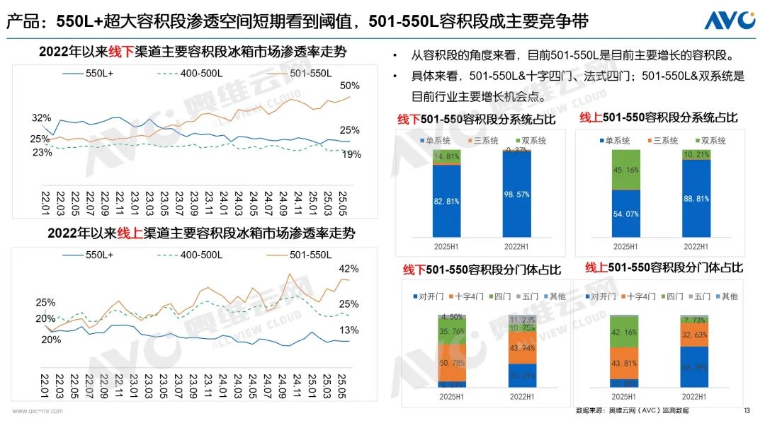 From the perspective of volume segment.Above 550L"The market penetration space for the super-large volume segment has reached a bottleneck."501-550L "The volume segment has become the mainstream competitive area in the refrigerator market, firmly occupying the core of current growth. In terms of channel penetration, starting from 2022, '501-550L"The penetration rate of the volume segment continues to rise across all channels, with an offline penetration rate reaching 50% and online exceeding 40%, significantly higher than..."400-500L"and"Above 550L"Volume segment."