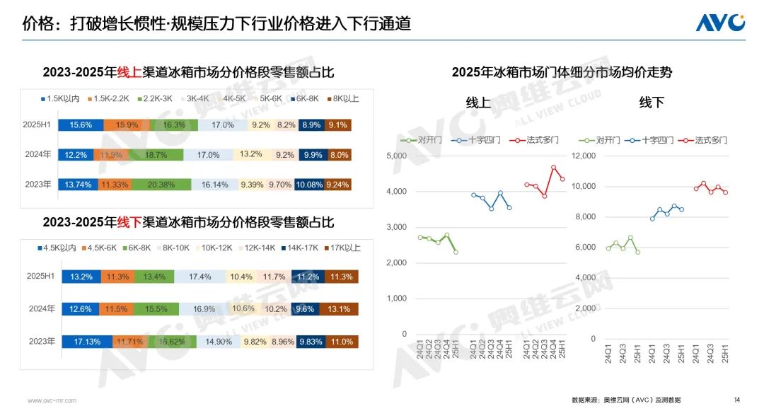 From the perspective of price, the momentum for structural upgrades in the refrigerator industry significantly slows down in the first half of 2025. According to monitoring data from AVC, the online channel price structure shows a clear change, with the market share of low-end models priced below 2.2K significantly increasing, becoming the main price segment for growth; meanwhile, in the offline channel, the market share of mid-to-high-end models priced between 8K and 14K shows a prominent upward trend, with the combined market share of this price range reaching 37.7% in 2024, and this proportion increasing to 39.5% by the first half of 2025.