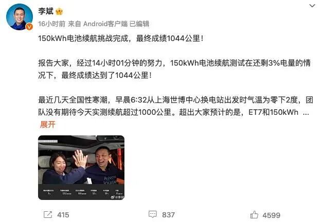 In December 2023, NIO Chairman Li Bin drove an ET7 equipped with a 150 kWh battery pack, starting a live-streamed endurance test from Shanghai heading south.
