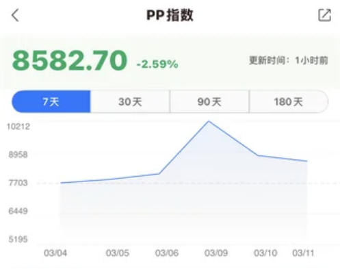 South China PP Price Index: 8,582.7 points, up 907.73 points (11.83%) week-on-week; among which, homopolymer PP for raffia increased by 1,500, fiber-grade PP by 1,700, copolymer PP by 1,500, thin-wall PP by 1,600, and homopolymer PP by 1,450.