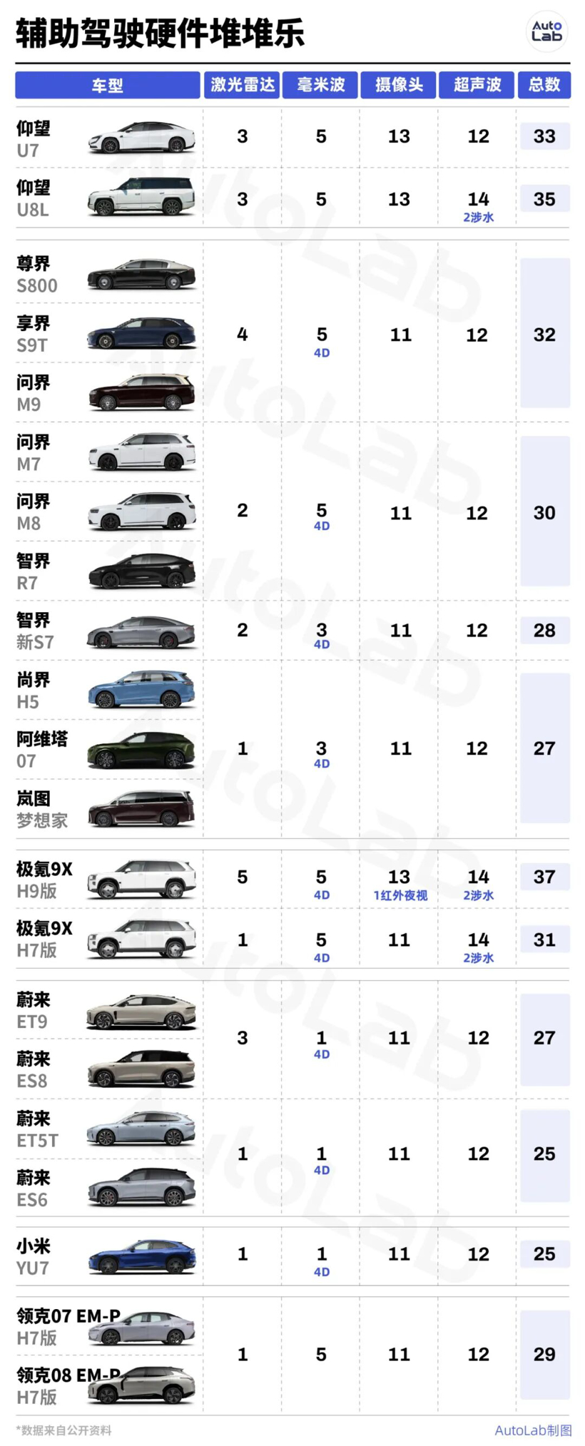 Next, we will showcase the updated hardware architecture for driver assistance from popular brands. One image will help you understand which is the "king of material stacking" among domestic driver assistance systems.
