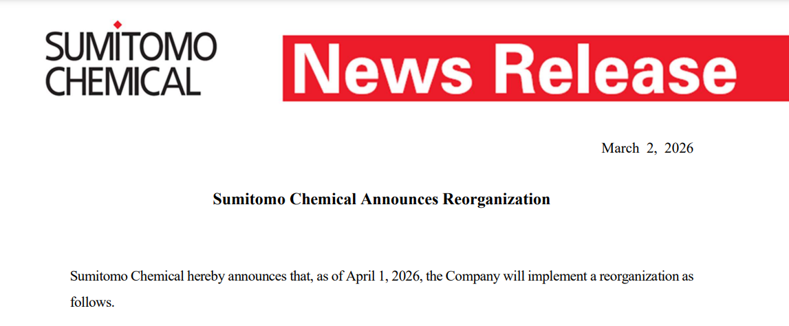 On March 3, Zhuan Su Shi Jie learned that Sumitomo Chemical announced on March 2 that it will implement the following organizational restructuring effective April 1, 2026.