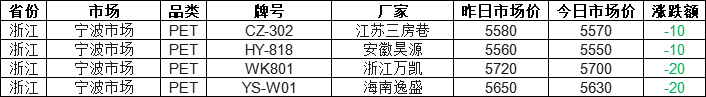 According to statistics from Zhuangsu Shijie, as of 4:00 PM on October 21, the PET market across the country is mostly seeing a decline! All market quotes have dropped by 100%, with the largest decrease being 20 yuan. Currently, the price of Zhejiang Wankai WK801 in the Ningbo market is 5,700 yuan. Today's PET price range in the market is between 5,550 and 5,700 yuan, with a market median of 5,600 yuan.