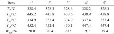 Notes:T5 is temperature at 5% mass loss;T50 is temperature at 50% mass loss;Tp1 is peak temperature 1 in DTG curves;Tp2 is peak temperature 2 in DTG curves;W600% is residual mass fraction at 600 ℃.