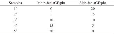 PA6 pellets and MCA are placed in a 120 ℃ oven for drying for 3 hours. After cooling, PA6, MCA, sGF, and other raw materials are weighed according to the formulation, where the main feeding formulation consists of 69 parts PA6, 10 parts flame retardant MCA, 0.6 parts lubricant EBS, 0.4 parts antioxidant 1010/168 (mass ratio 3:1), and a total of 20 parts sGF, with the main feed amount and side feed amount of sGF shown in Table 1. First, the main feed raw materials are manually mixed in a 30 cm×45 cm polyethylene bag. Then, the materials are fed into a twin-screw extruder for extrusion granulation via a loss-in-weight feeder with main and side feeding according to the proportions, as shown in Figure 1. The heating temperature of the twin-screw extruder is set between 200-250 ℃, with the die head at 245 ℃; the main screw speed is set at 350 r/min, with an output of 50 kg/h. Finally, the extruded MCA/sGF/PA6 composite material is placed in a 120 ℃ oven for drying for 4 hours and then processed into test specimens using an injection molding machine.