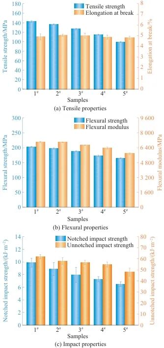 (1) Tensile strength was tested according to GB/T 1040.2-2022 with a tensile rate of 10 mm/min; flexural strength was tested according to GB/T 9341-2008; impact performance was tested according to GB/T 1043.1-2008.